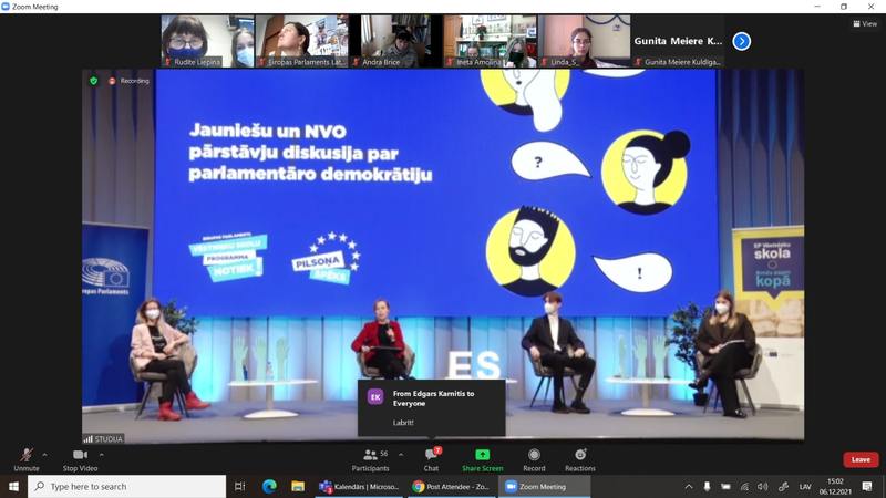 6.decembrī piedalījāmies Eiropas Parlamenta Vēstnieku skolu parlamentārās demokrātijas cikla diskusijā, kurā kopā ar izciliem pilsoniskās sabiedrības līderiem iepazinām nevalstiskās organizācijas (NVO), to darbību un iespējas iesaistīties. Pasākumā klātienē piedalījās mūsu skolas 12.klases skolnieks Artis Krastiņš, tiešsaistē pasākumā piedalījās grupa mūsu skolas EPVS audzēkņi.
